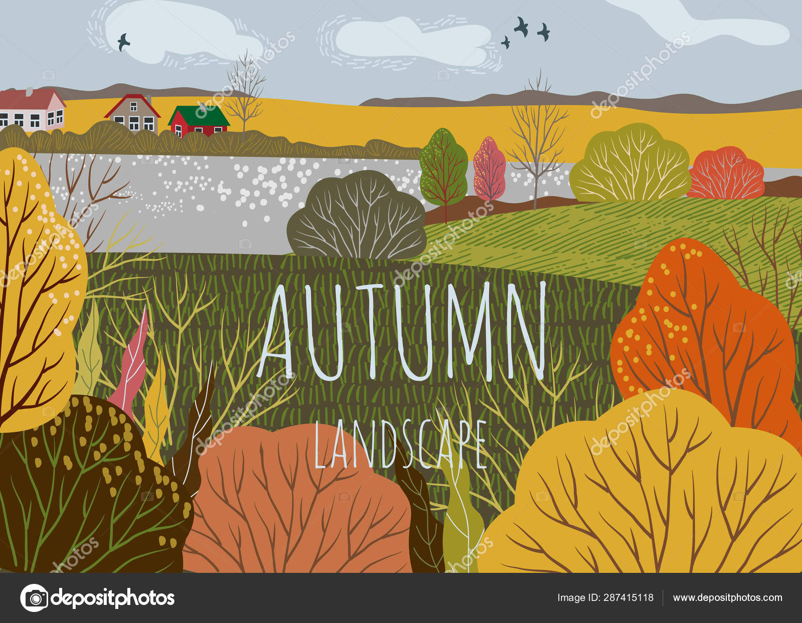 Herfst Landschap Schattig Plat Horizontale Vector Illustratie Van