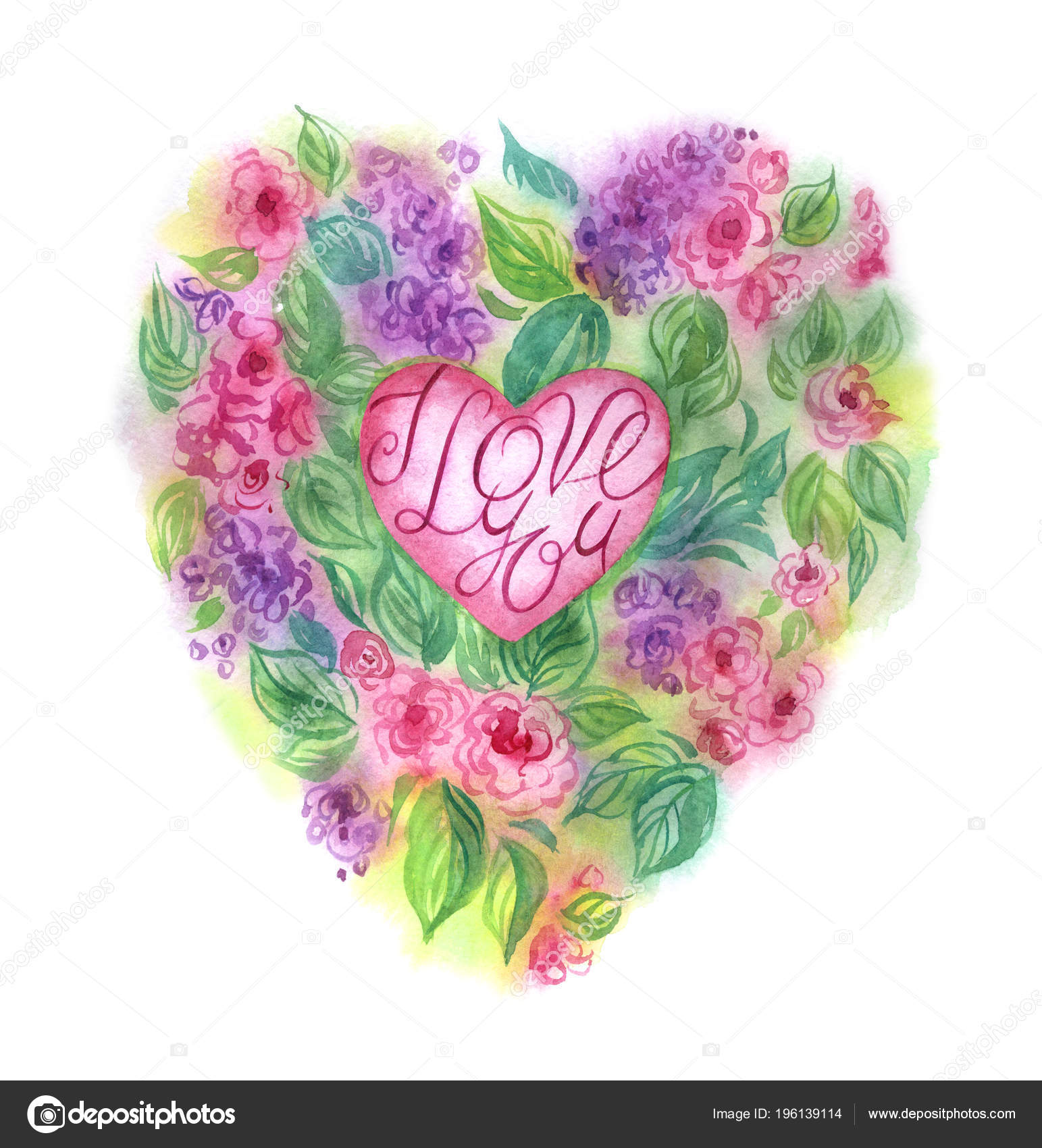 Hart Van Bloemen Met Inscriptie Love You Aquarel Tekenen Een