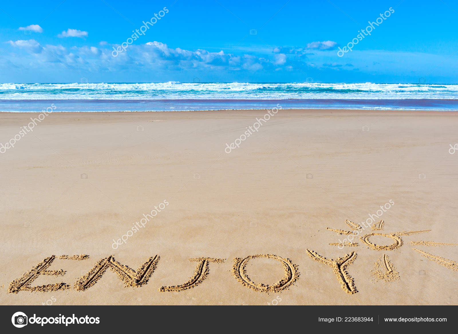 Geniet Van Inscriptie Het Natte Strand Zand Onder Zon Tekenen