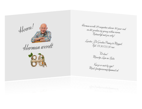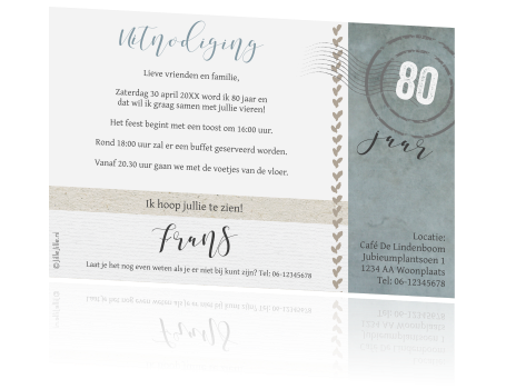 En dat komt door de volgende elementen op de kaart. Je kunt ook met een blanco kaartje beginnen en zelf foto s toevoegen. Natuurlijk kun je zelf bepalen wat voor leuke tekst er op de uitnodigingskaart komt te staan. Je kunt eenvoudig een proefdruk bestellen van je uitnodiging 80 jaar verjaardag.