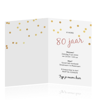 Verjaardag uitnodiging 80 jaar. En om het. Dit wil ik graag met kinderen kleinkinderen familie vrienden en kennissen vieren met een hapje en een drankje. Bewerk de kaart of maak een uitnodiging verjaardag 80 jaar zelf en klik door naar voorbeeld om door te gaan naar het bestelproces. Daarna klik je door om al de bestelgegevens in te vullen.